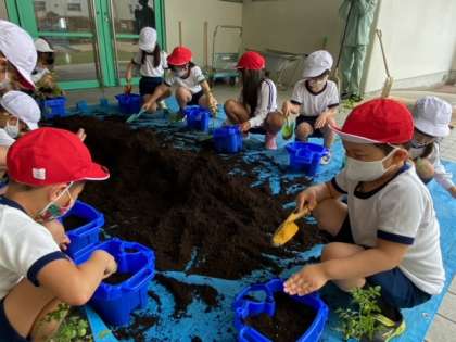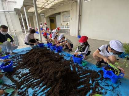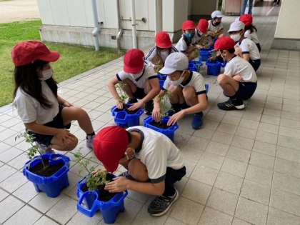 1組の子どもたちも、2組のこどもたちも、ていねいに植え替え作業をおえました。