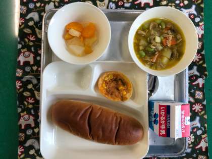 豚肉と野菜のスープ煮、変わりピザ、ミックスフルーツ缶、黒糖パン、牛乳