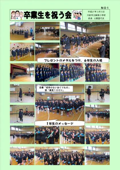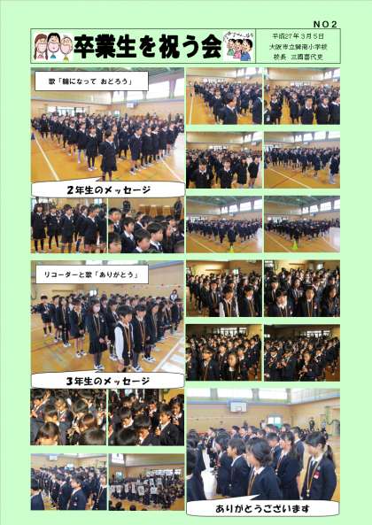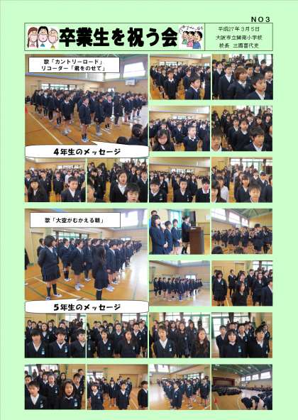 3/5(木)1年生〜5年生の在校生が、卒業していく6年生に、心温まる歌と感謝のメッセージを伝えました。6年生一人一人にプレゼントもしました。