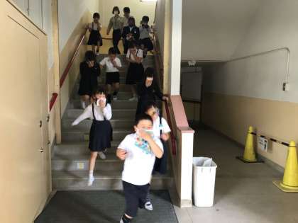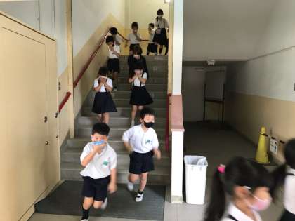非常ベルが鳴ったあと、子どもたちが、二度目の放送を聞いて迅速に避難しました。階段から運動場へ、運動場へ出てからは走っています。