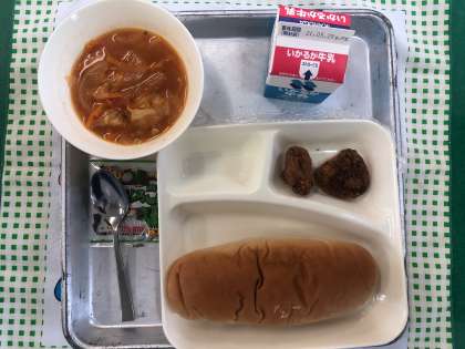 一口トンカツ、ミネストローネ、豆こんぶ、黒糖パン、牛乳