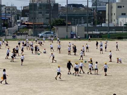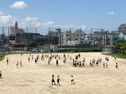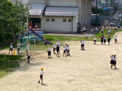 2限後の20分休み、子どもたちが、気持ちよさそうに、運動場で遊んでいます。楽しそうな声が、2階まで聞こえてきます。