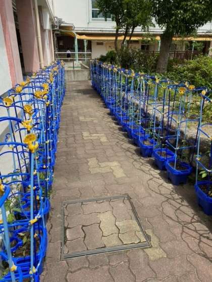 2年生の子どもたちが、20日に植え替えた「ミニトマト」が太陽の光をあびて成長しています。