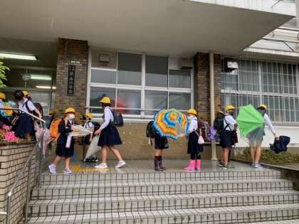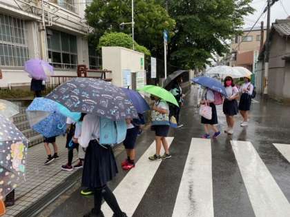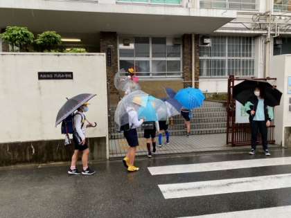 雨が降る中を、子どもたちが登校してきました。傘をたたんで教室に向かいます。