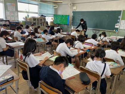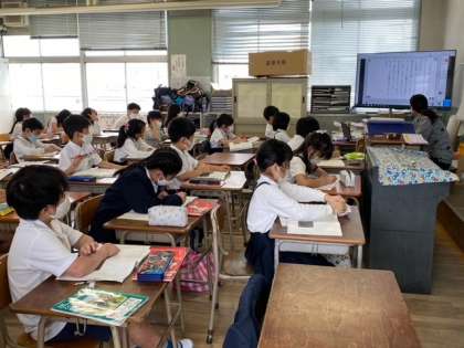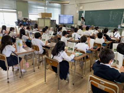 1組の国語科は、「自然のかくし絵」の単元です。教科書を音読しています。