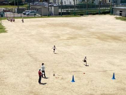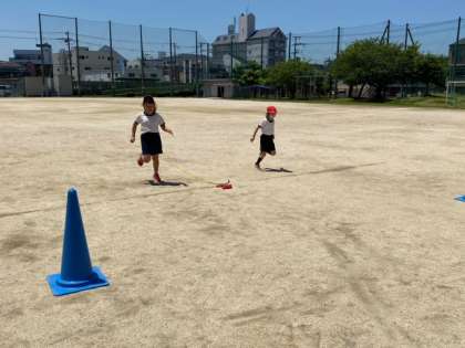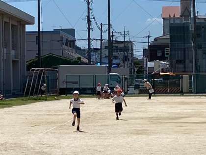 運動場で、50メートル走のタイムをはかりました。一生懸命に走りました。