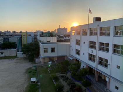 18時半過ぎの東館から見た校舎です。今日の日の入りは19時5分、明日の日の出は4時46分との予報です。