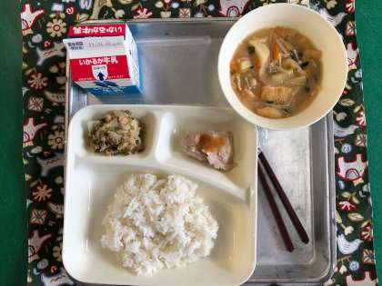 鶏肉のおろしじょうゆかけ、みそ汁、野菜いため、牛乳