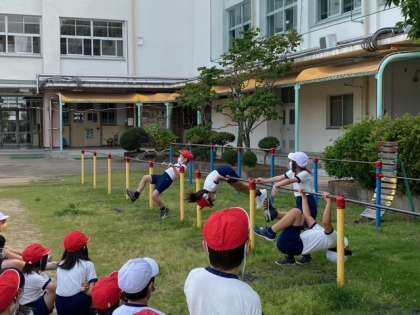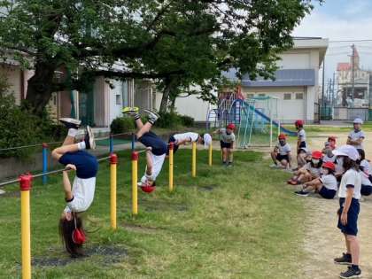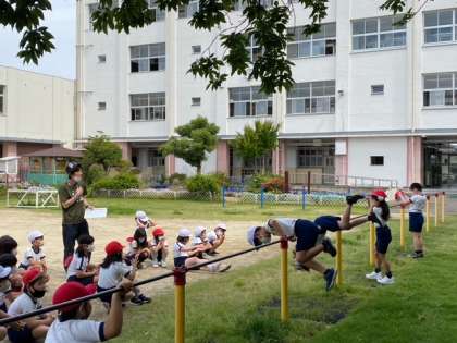 鉄棒で、「前まわり」や「逆上がり」をしました。頑張っている子どもたちに拍手をしていました。
