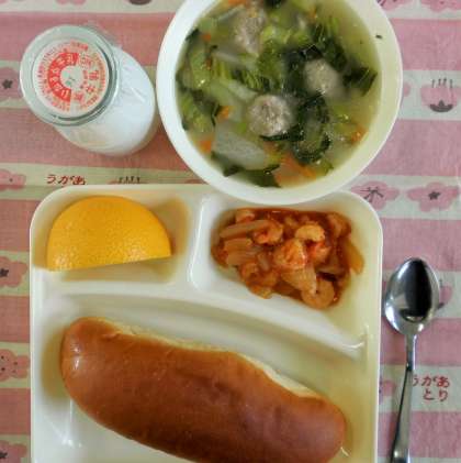 えびのチリソースいため、中華がゆ、はっさく、黒糖パン、牛乳