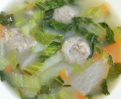 肉だんご、だいこん、チンゲンサイ、しいたけの入った中華がゆです。
