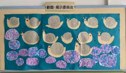 あじさいの花が一面に咲き、多くのカタツムリがゆっくりと行進しています。