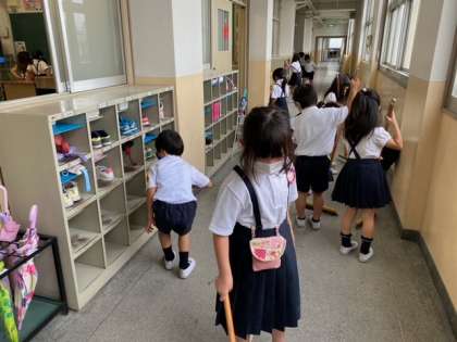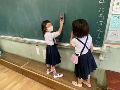 校舎をまわっていると、休み時間なのに、1年生1組の子どもたちが、掃除をしていました。