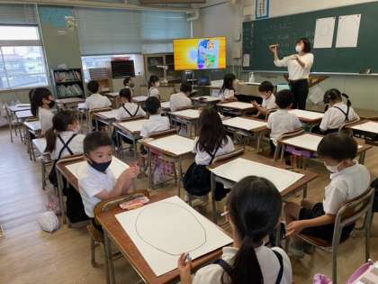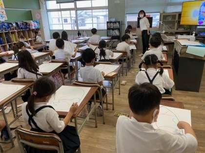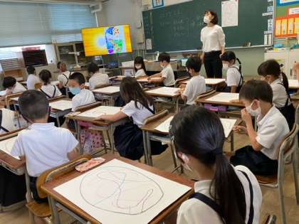 画用紙に大きなたまごを書きました。もようが、おしゃれでおもしろく、「見たら幸せになる」ようなたまごをつくっていきます。
