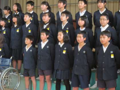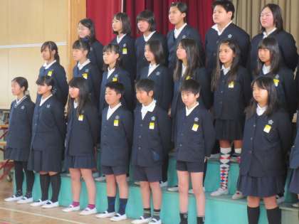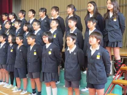舞台では6年生が呼びかけとともに、「この星に生まれて」と「旅立ちの日に」の曲を、気持ちのこもった歌声で講堂全体に響かせていました。担任の先生の目が涙で・・・光っていました。