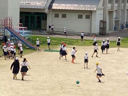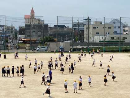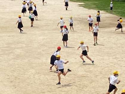 運動場の風景です。先生と一緒に遊んでいる子どもたちもいます。