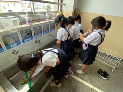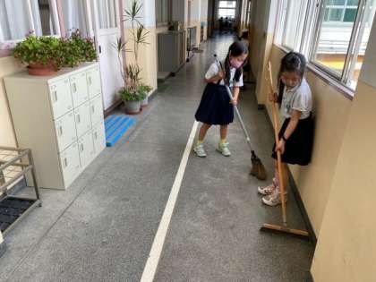 給食後の掃除の時間です。2階の職員室前廊下や洗面所を綺麗にしてくれています。