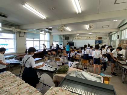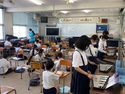 音楽室で、「星空はいつも」を「うた・リコーダー・鉄琴」のパートに分かれて練習していました。
