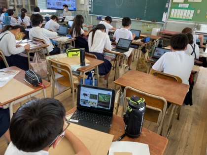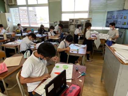 図画工作科で、ホワイトボードに下絵を描いて伝言板を作ります。タブレット端末を使って下絵に書くものを調べている子どもたちもいました。