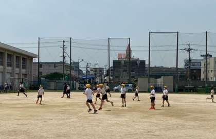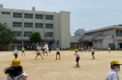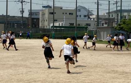 運動場では、子どもたちが「おにごっこ」や「ボール遊び」に夢中になっています。