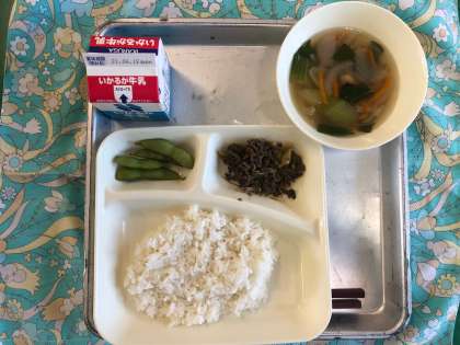チンジャオニューロウスー、ハムと野菜の中華スープ、えだまめ、ご飯、牛乳