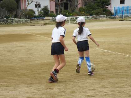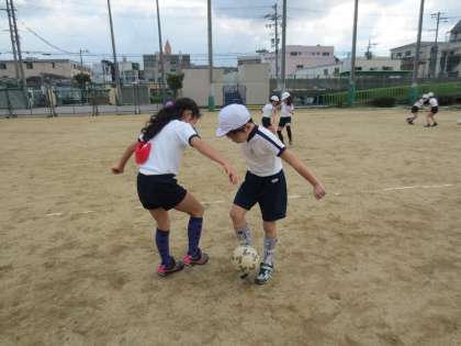 2人組のパス練習の後、ペアーでボールのとり合いをしています。相手に背中をむけたり、素早く動き方向をかえたりして、とても上手にボールをコントロールしています。