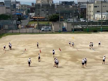 1組の子どもたちが運動場でバトンの受け渡しの練習をしていました。