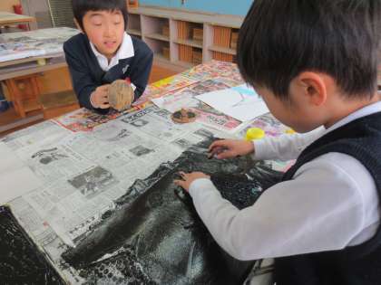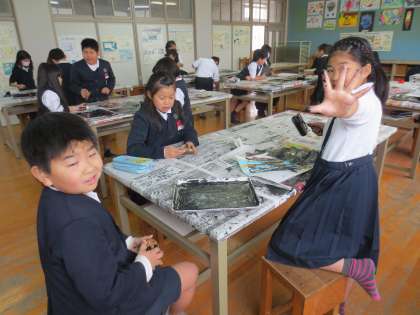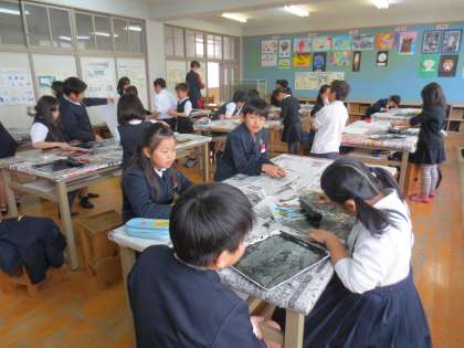 図工室で版画をしています。いろいろと工夫をしていますが・・・手は真っ黒です。