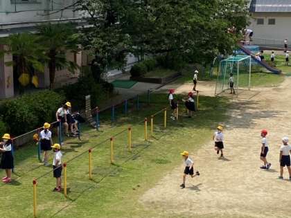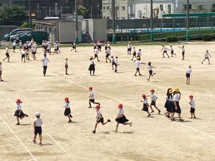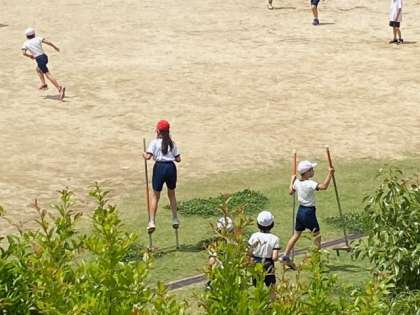 いいお天気です。運動場では、子どもたちが、鬼ごっこやドッジボール・鉄ぼう・竹馬などで思い思いに遊んでいます。