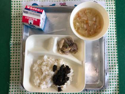 豚肉のごまみそ焼き、すまし汁、のりのつくだ煮、ご飯、牛乳