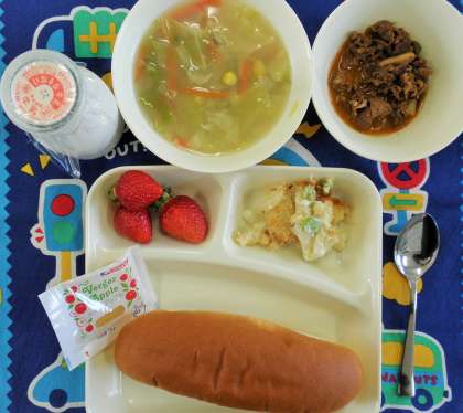 ビーフチャップ、ほたて貝のグラタン、コーンスープ、いちご、コッペパン、りんごジャム、牛乳 (卒業お祝い献立)