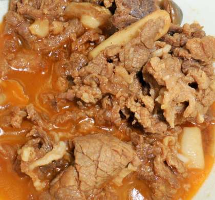 にんにくの風味をつけた牛肉を塩、こしょう、りんごピューレ、ケチャップ、ウスターソースで味付けしています。