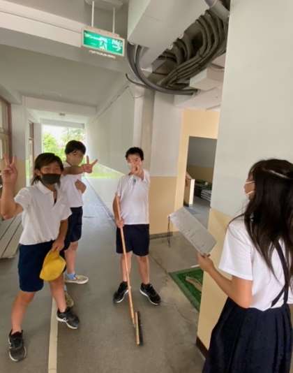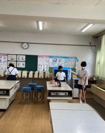 清掃時間の一コマです。家庭科室とその前の廊下を6年生の児童が掃除していました。掃除カードでチェックもしています。協力してできました。