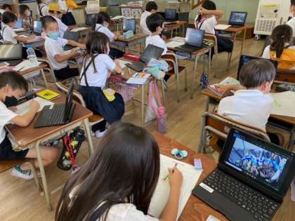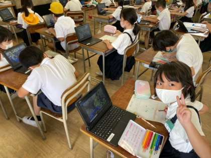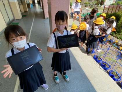 子どもたちが、タブレット端末を手に、プランターで育てている「ミニトマト」を撮影しました。教室に戻って、タブレットの写真を見て絵をかきました。しっかり観察できました。