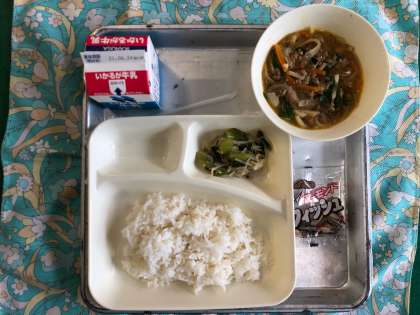 マーボーはるさめ、チンゲンサイともやしの甘酢あえ、アーモンドフィッシュ、ご飯、牛乳