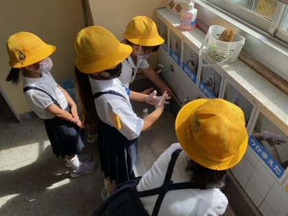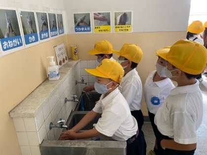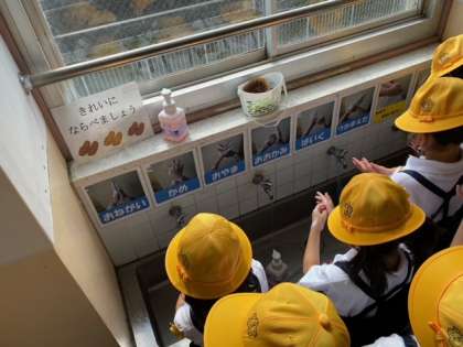 休み時間の終わりや給食の前などに、子どもたちが、ていねいに手洗いをしています。