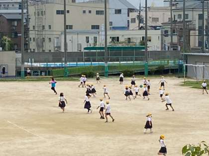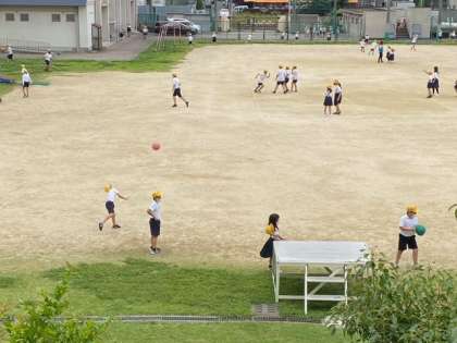 運動場で、子どもたちが勢いよく走っています。先生も走っています。ボール投げをしている子どもたちもいます。