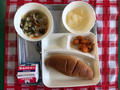 えびのチリソース、中華スープ、和なし(かんづめ)、黒糖パン、牛乳
