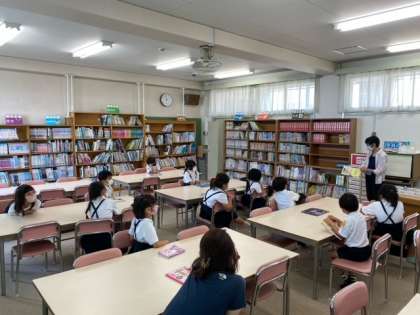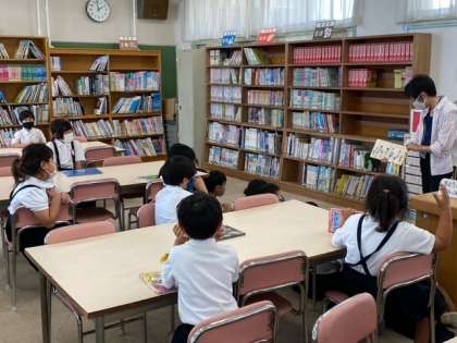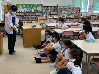 子どもたちが、絵本の読み聞かせをしてもらっています。興味深くお話に聞き入っていました。