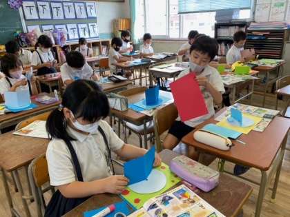図画工作科の「くるくるランド」です。紙を重ねてわりぴんでとめ、くるくる回るものを作ります。子どもたちは、工作に夢中になっていました。