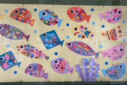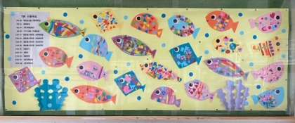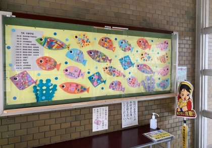 7月の玄関掲示です。2年生の子どもたちが協力して一生懸命に作りました。お魚がいっぱい泳いでいます。