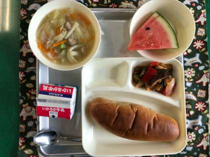鶏肉と夏野菜のソテー、押麦のスープ、すいか、パン、いちごジャム、牛乳