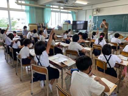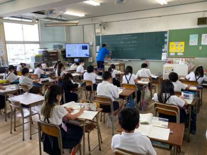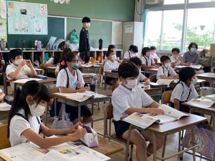 1組の道徳科は、「雨のバスていりゅう所で」です。みんなが気持ちよく生活するためにどんなことに気をつければよいか考えました。教育実習生が参観しています。