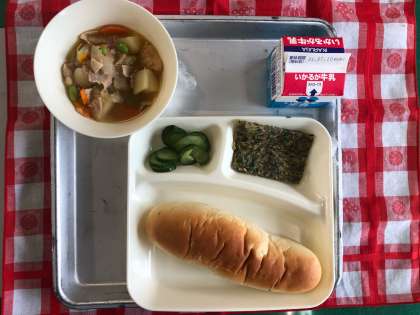もずく入りヒラヤーチー、豚肉とあつあげの煮もの、あっさりきゅうり、米飯、牛乳