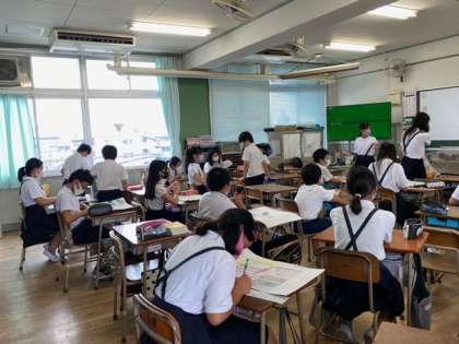 1組の子どもたちが、図画工作科で描いた作品のコメントを考えていました。