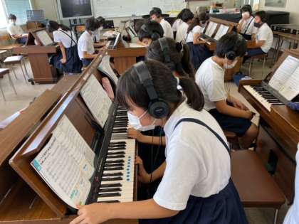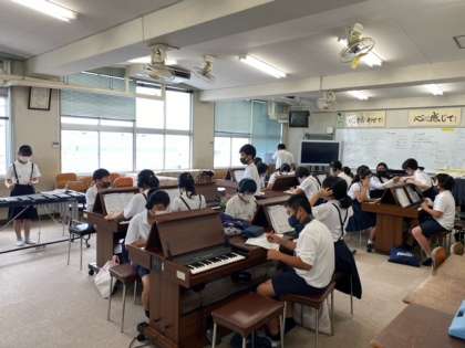2組の音楽科では、子どもたちが「ラバースコンチェルト」の合奏にむけて楽器の練習をしました。