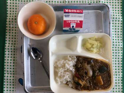 夏野菜のカレーライス、キャベツのサラダ、みかん(冷)、牛乳