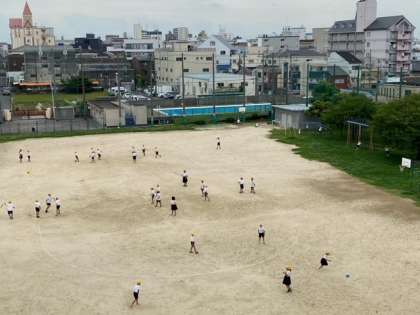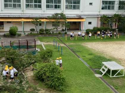 どんよりとした空模様です。休み時間になると、子どもたちが運動場いっぱいに広がって、ボール遊びや鬼ごっこをしています。鉄棒で遊んでいる子どもたちもいます。
