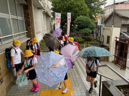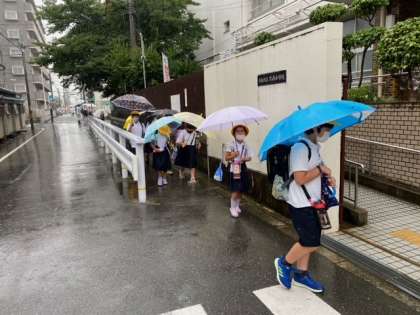 朝から雨が降っています。傘をさして子どもたちが登校してきました。