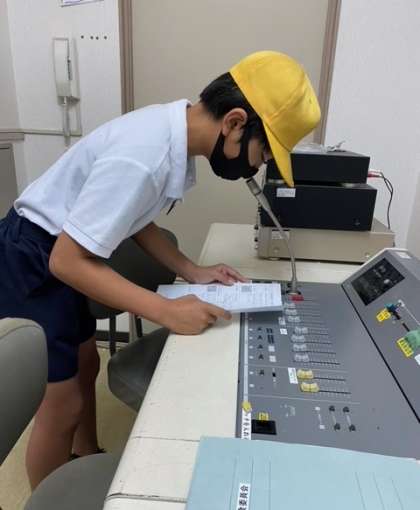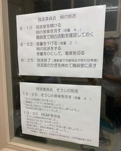 「朝の音楽」を流した後、「今日の天気や予定」を伝え、「雨なので休み時間の過ごし方を考えましょう」と放送で呼びかけました。